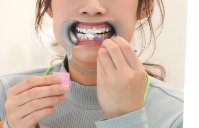 まずは歯の表面を軽くブラッシングして、汚れや食べカス、表面の膜を取り除きます。